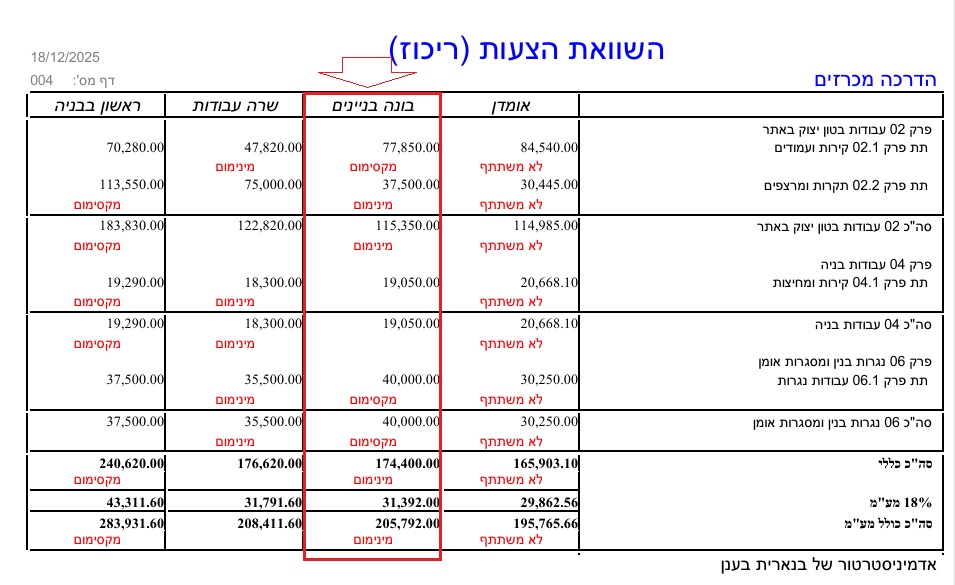 10. בריכוז נאתר את הקבלן שהגיש את ההצעה הזולה ביותר. בדוגמה המוצגת בצילום המסך הבא זהו הקבלן “בונה בניינים“: