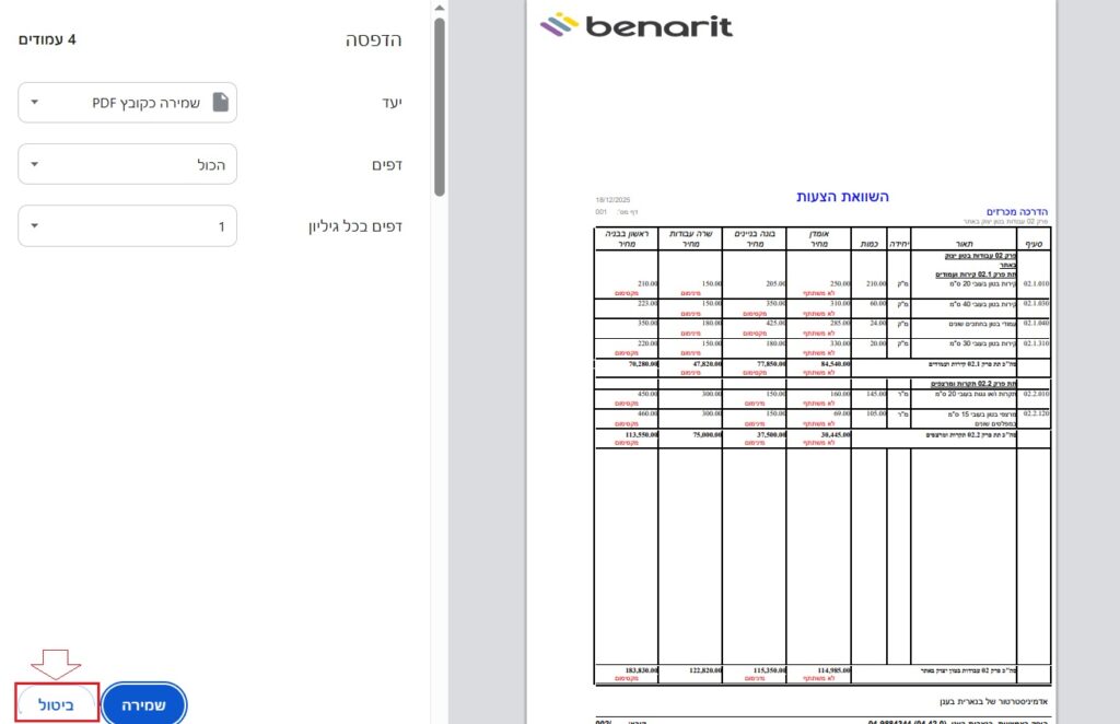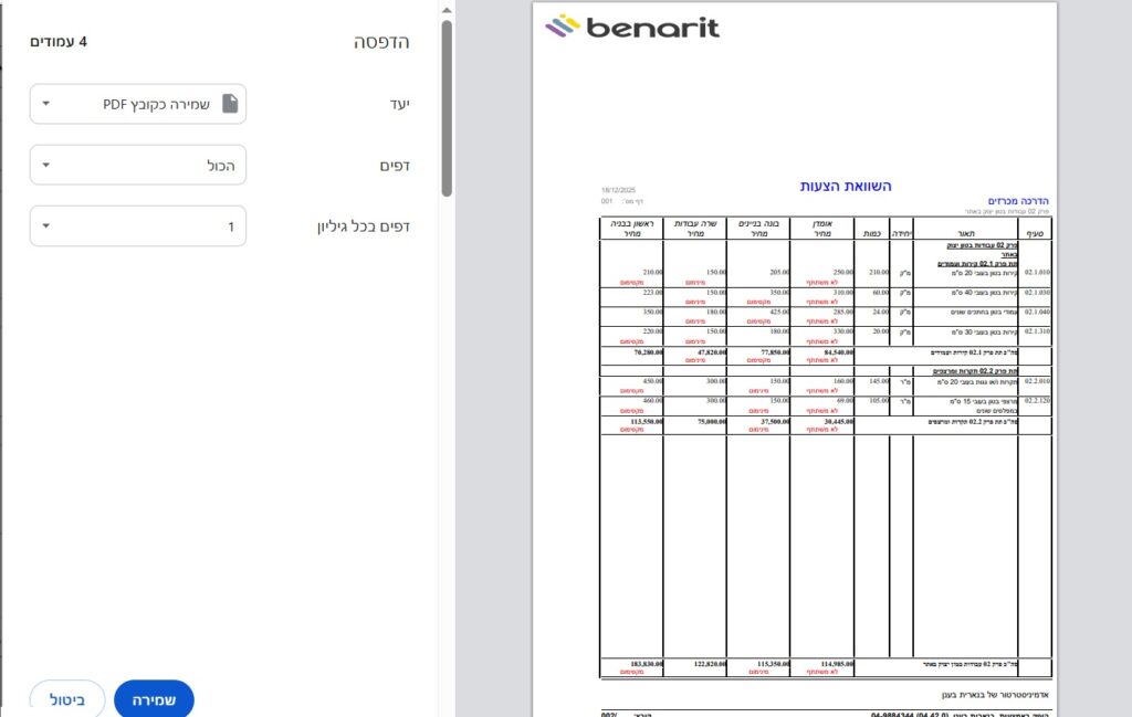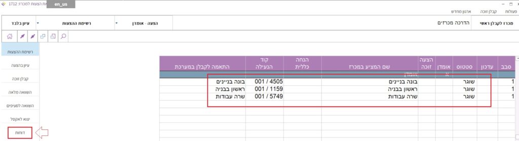 5. נפתח המסך “השוואת הצעות” המציג את רשימת ההצעות שהוגשו על ידי הקבלנים. כדי להפיק טבלת השוואה, יש ללחוץ על הכפתור “דוחות” בסרגל הכלים השמאלי: