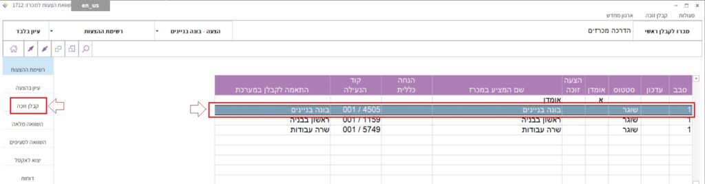 נסמן את שורת הקבלן הזוכה “בונה בניינים” ונלחץ בסרגל מצד שמאל על “קבלן זוכה“: