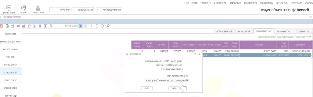 23. נפתחת חלונית המציגה את פרטי מסמך המקור ממנו הופק המכרז. ברירת המחדל המסומנת היא להעתיק את מחירי המכרז וההנחות בכתב הכמויות של המכרז אל מסמך המקור. לוחצים על “אישור“: