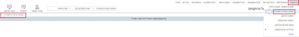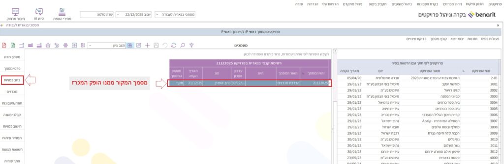 26. במקביל, המחירים בכתב הכמויות של המכרז (מחירי ההצעה הזוכה) הועתקו אל מחירי כתב הכמויות במסמך המקור ממנו הופק המכרז. משורת התפריטים הראשית נבחר ב”פרויקטים“> “מסמכי בנארית לעבודה“: