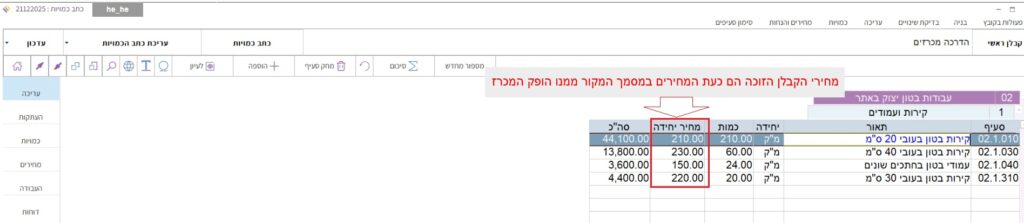 13. כעת נבצע העברה של מחירי הקבלן הזוכה מהשוואת ההצעות אל כתב הכמויות.