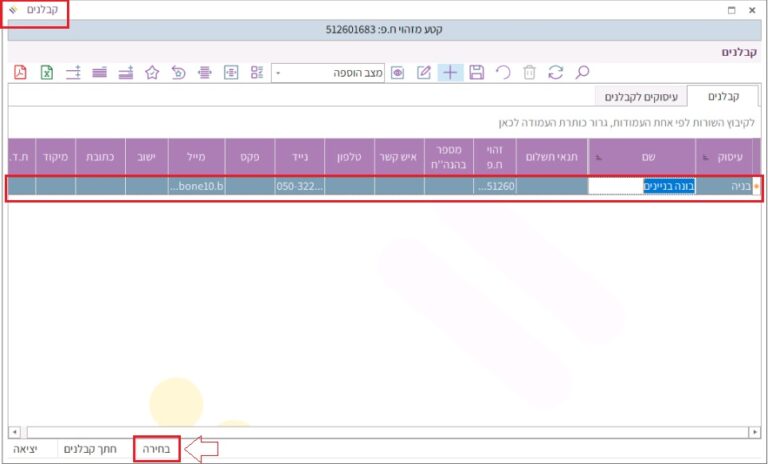 לאחר שהקבלן הוסף לרשימה, נוודא שהשורה שלו מסומנת, ונלחץ על הכפתור “בחירה” למטה: