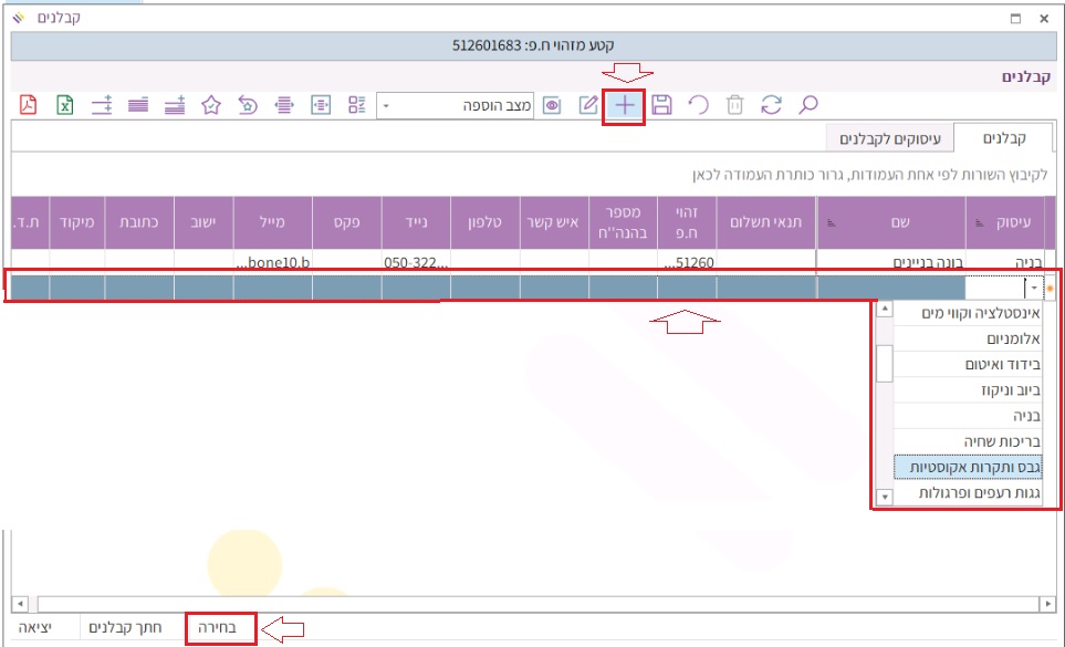 16. אם הקבלן שהגיש את ההצעה הזוכה לא מופיע ברשימה, יש להוסיף אותו באמצעות כפתור ההוספה (הפלוס) בסרגל האייקונים.