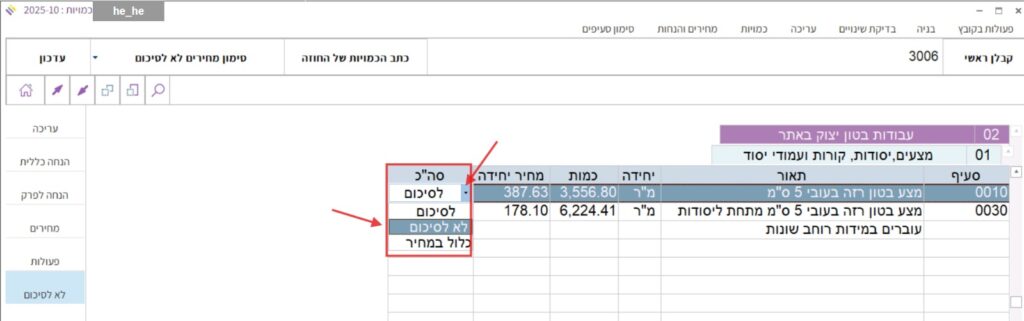 3. עומדים על הסעיף שאותו מבקשים לסמן כ”לא לסיכום”, ובעמודה “סה”כ” בוחרים “לא לסיכום”: