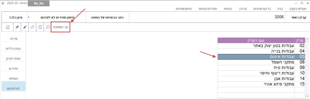 4. אם רוצים לסמן פרק שלם כ”לא לסיכום” – מסמנים את הפרק ולוחצים בסרגל שמעל כתב הכמויות, בצד שמאל, על כפתור “קב’ מסומנת”, בחלונית שנפתחת, לוחצים על “אישור” כדי לקבוע שהמחירים בפרק יסומנו “לא לסיכום”: