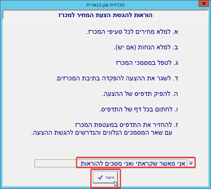 יש לקרוא בעיון את ההוראות, ולאחר מכן לסמן V בתיבת הסימון “אני מאשר שקראתי ואני מסכים להוראות” וללחוץ על “אישור”: