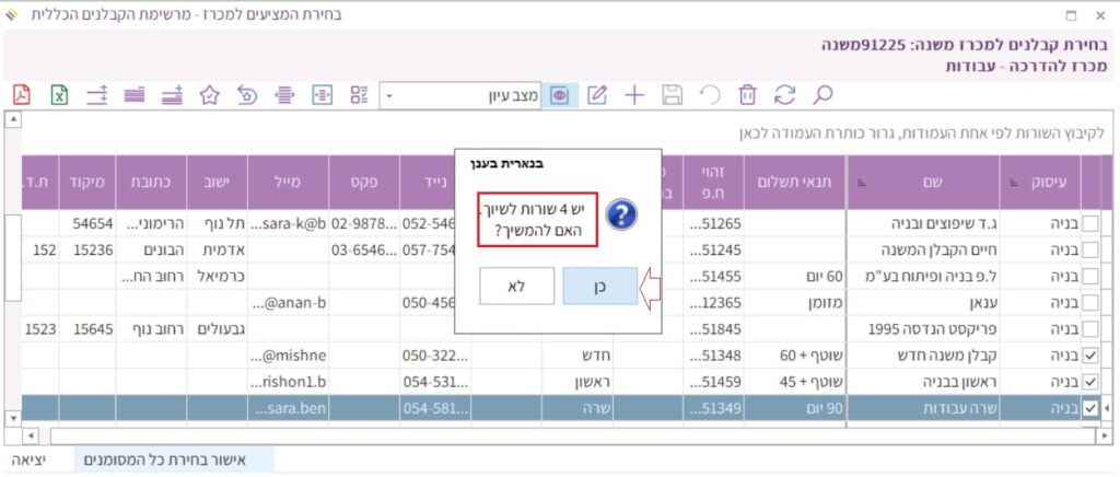 מתקבלת הודעה על מספר השורות לשיוך (שורה לכל קבלן משנה שסומן). יש ללחוץ על “כן“.