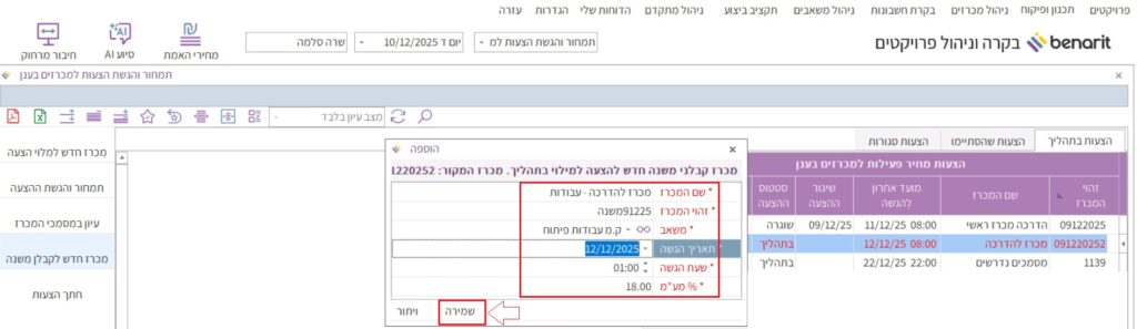 בחלונית זו יש להגדיר שם וזיהוי ייחודי למכרז קבלן המשנה, ולבחור מתוך קטלוג המשאבים את המשאב המתאים למכרז (למשל, משאב ק.מ עבודות פיתוח), יש לקבוע את המועד האחרון (תאריך ושעה) להגשת ההצעות על ידי קבלני המשנה, ואת אחוז המע”מ.