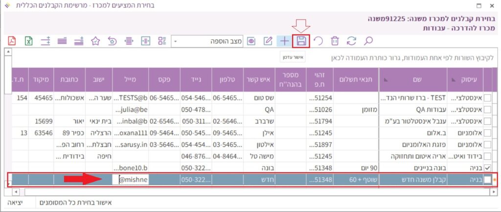 ואז לסמן V בתיבת הסימון בשורה של הקבלן שהוסף, וללחוץ למטה על “אישור בחירת כל המסומנים“: