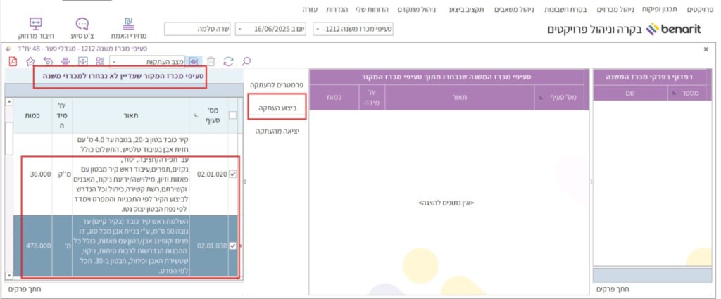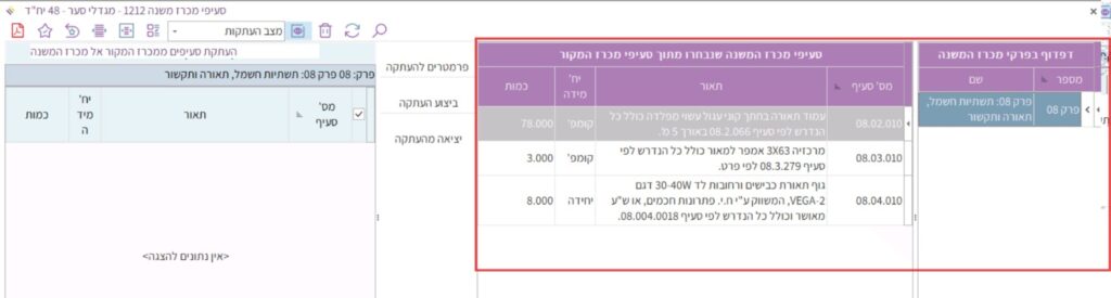 לאחר לחיצה על “ביצוע העתקה” יועתקו כל הסעיפים המסומנים מהחלונית השמאלית אל האזור הימני של המסך שמציג את סעיפי מכרז המשנה: