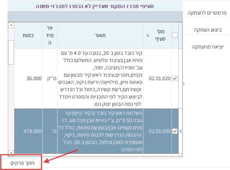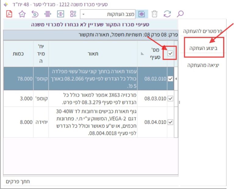 לאחר סימון המבנה/פרק/תת-פרק שרוצים להעתיק יש ללחוץ למטה על “ביצוע“: