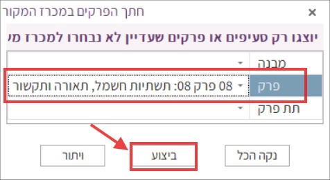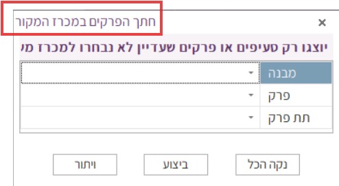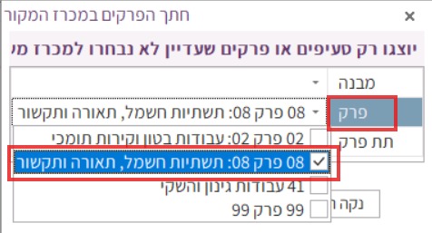 כעת, בחלק השמאלי של המסך יוצגו רק הסעיפים של הפרק הנבחר. יש לסמן V בתיבת הסימון הגורפת מעל רשימת הסעיפים.