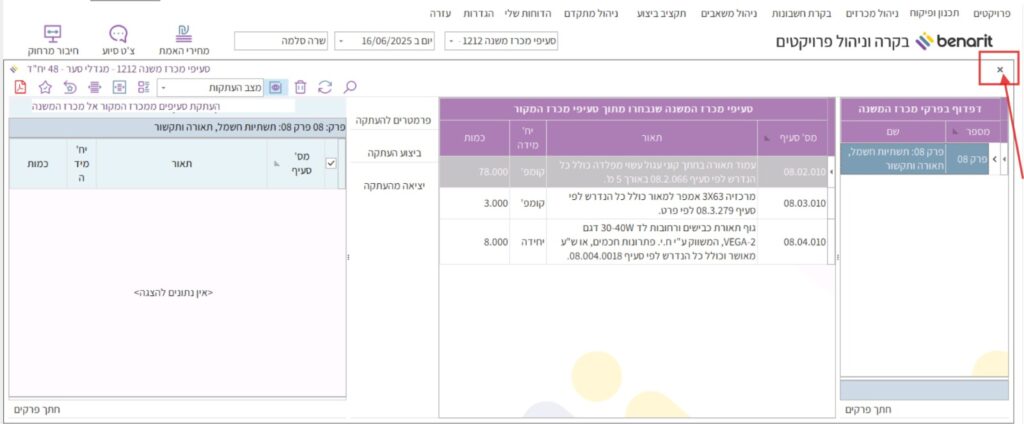(4) בתום העתקת הסעיפים יש ללחוץ על כפתור ה-X בפינה הימנית העליונה של המסך “סעיפי מכרז משנה“: