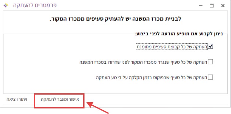 בחלונית זו יש מספר אפשרויות שמתייחסות למצבים שבהם יופיעו התרעות במהלך העתקת הסעיפים לפני ביצוע ההעתקה.