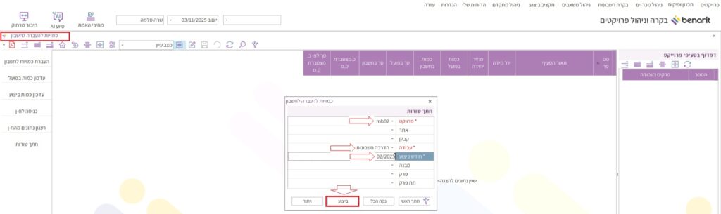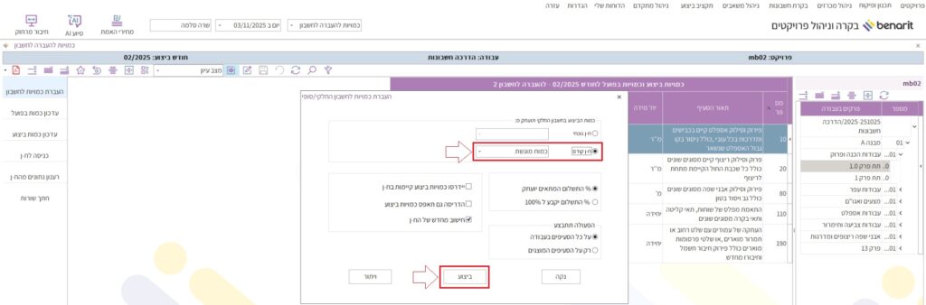 2. בחלונית החתך בוחרים את הפרויקט והעבודה ומזינים את חודש הביצוע של החשבון החדש שאליו רוצים להעביר את הכמויות המוגשות. לוחצים על “ביצוע”: