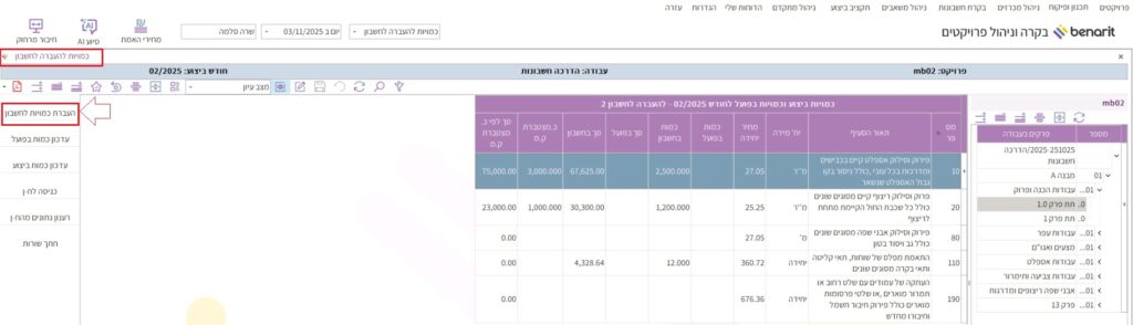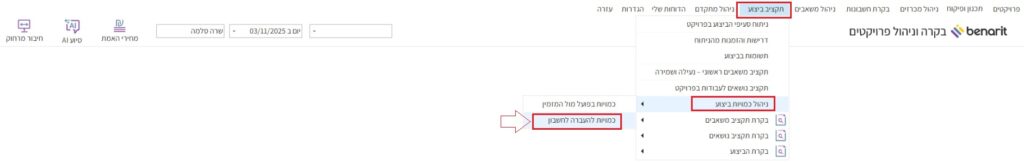 1. במסך הראשי של התוכנה, משורת התפריטים העליונה בוחרים בתפריט “תקציב ביצוע” > “ניהול כמויות ביצוע” > ולוחצים על “כמויות להעברה לחשבון”