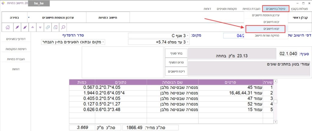 3. נכנסים לתפריט “טיפול בחישובים” > בוחרים בפקודה “יצוא חישובים”:
