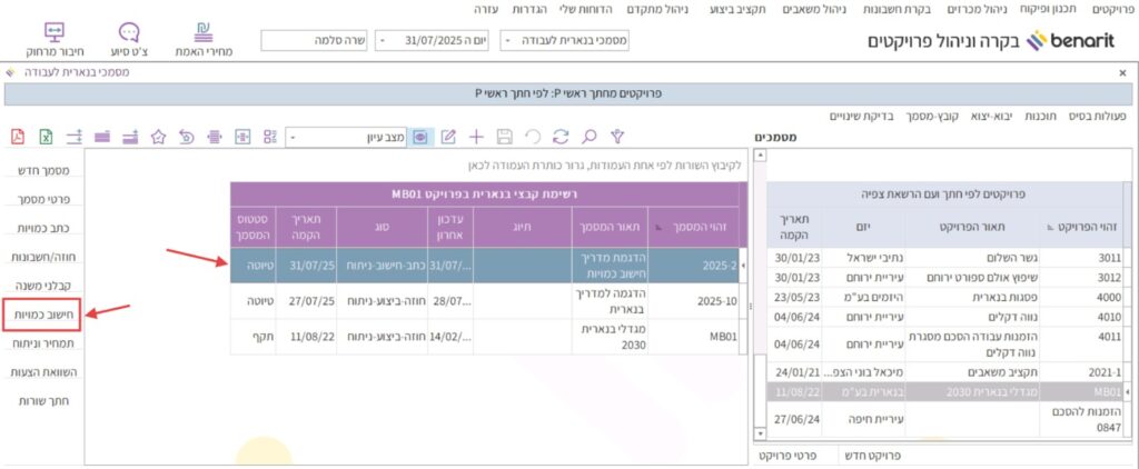 1. במסך “מסמכי בנארית לעבודה”, עומדים על הקובץ שבו נערכו החישובים ולוחצים על “חישוב כמויות” בסרגל הכפתורים השמאלי: