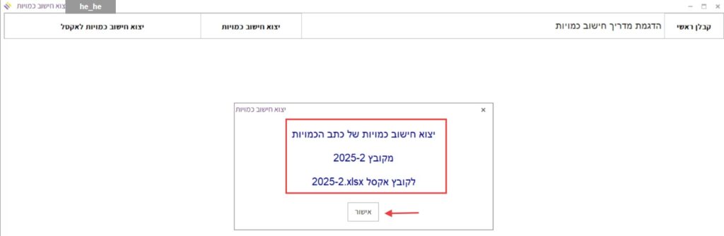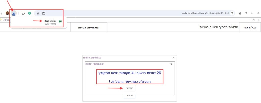 5. מתקבלת חלונית מידע על מספר שורות החישוב שיוצאו מהקובץ ובצד שמאל של המסך, למעלה, מתקבל חיווי על קובץ האקסל שנוצר בתיקיית ההורדות במחשב. לוחצים בחלונית על “אישור”: