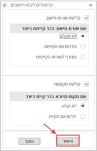 9. בחלונית “פרמטרים ליבוא חישובים” מסמנים את האפשרויות הרצויות ולוחצים על “אישור”:
