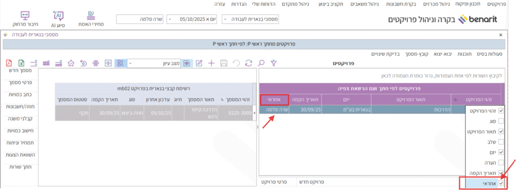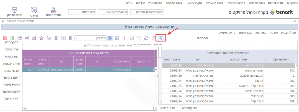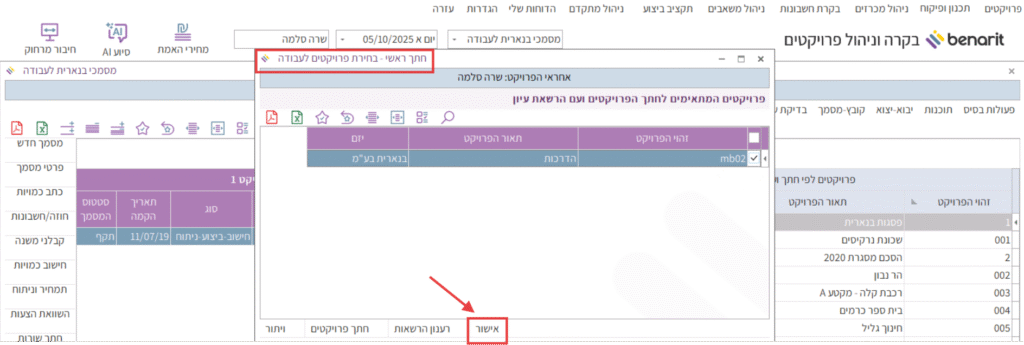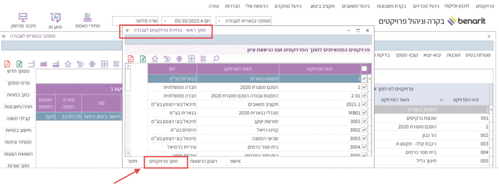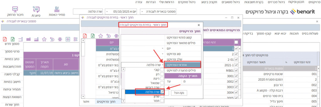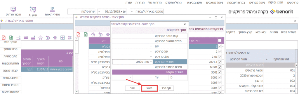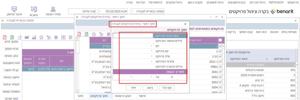 4. נפתחת חלונית נוספת “חתך ראשי- בחירת פרויקטים לעבודה”, שבה ניתן להגדיר פרמטרים לסינון רשימת הפרויקטים: