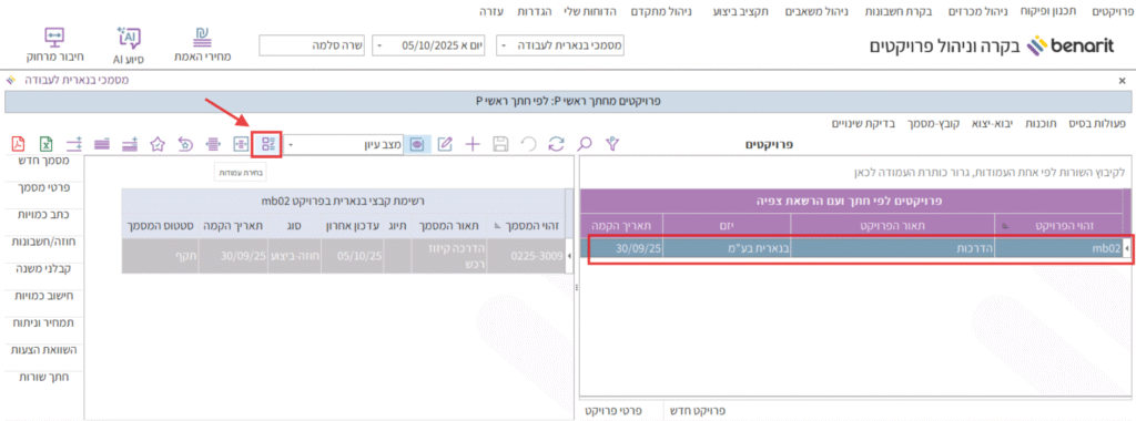 2. בסרגל האייקונים, ללחוץ על הכפתור המסמל “חתך ראשי – בחירת פרויקטים לעבודה”: