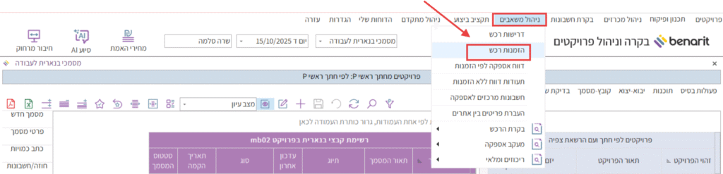 1. במסך הראשי של בנארית להיכנס לתוכנת “ניהול משאבים” > “הזמנות רכש”: