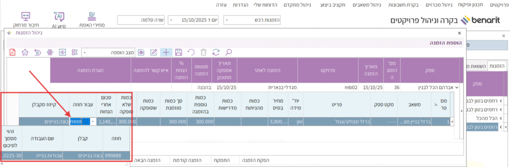 לאחר שהופעל מנגנון קיזוז הרכש האוטומטי בחוזה של קבלן המשנה, כפי שהוסבר בשלב הקודם, יש להגדיר הזמנת רכש בתוכנת “ניהול משאבים” ולקשר את הפריטים המוזמנים לחוזה של קבלן המשנה שממנו רוצים לקזז את עלות הרכש, בהתאם להנחיות הבאות: