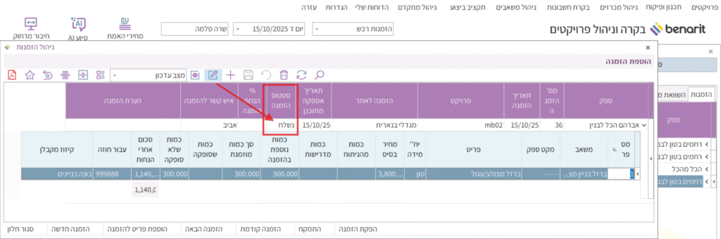 4. כדי שסכום הרכש שהוזמן עבור קבלן המשנה יבוא לידי ביטוי במסך “קיזוז רכש” בחשבונות של קבלן המשנה, יש להעביר את סטטוס הזמנת הרכש ל”מאושר” או “נשלח”: