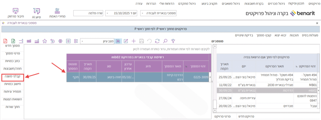 יש לחזור אל מסך “מסמכי בנארית לעבודה”, לסמן את הקובץ שבו הוגדר החוזה מול קבלן המשנה ולהיכנס אל תוכנת “קבלני משנה”: