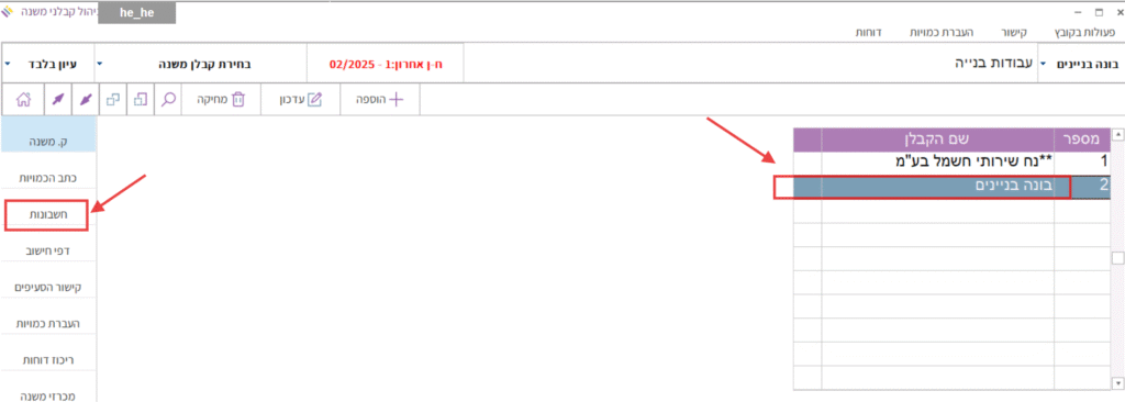 6. ברשימת קבלני המשנה יש לסמן את קבלן המשנה שבחוזה שלו הוגדר המנגנון של קיזוז רכש אוטומטי, ואז ללחוץ בצד שמאל על הכפתור “חשבונות”: