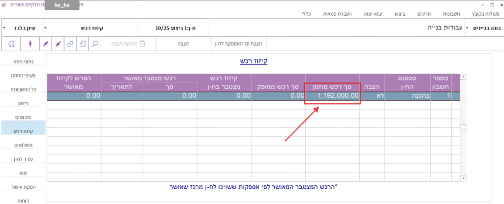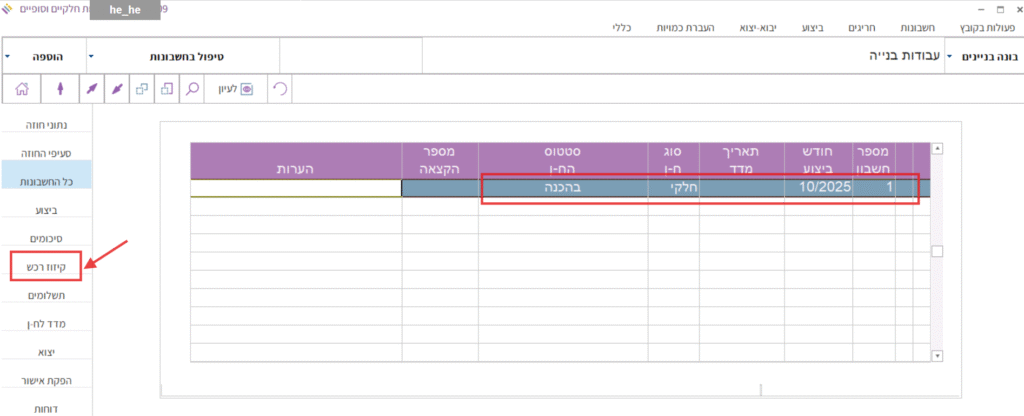 5. כעת נוודא שסכום הרכש שהוזמן עבור קבלן המשנה בא לידי ביטוי במסך “קיזוז רכש” בחשבונות של קבלן המשנה.