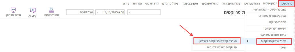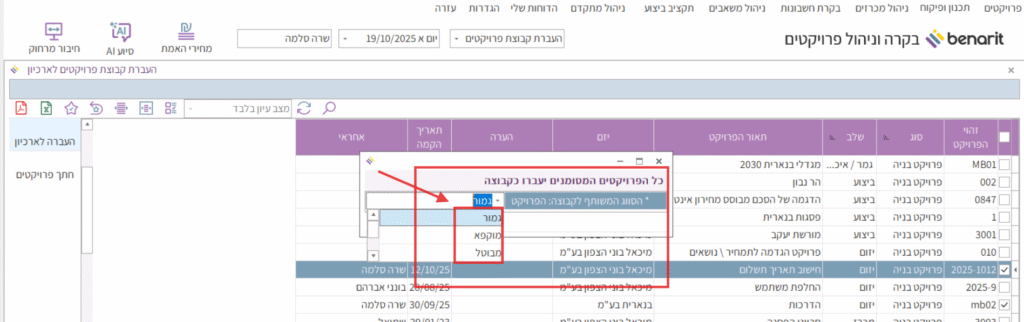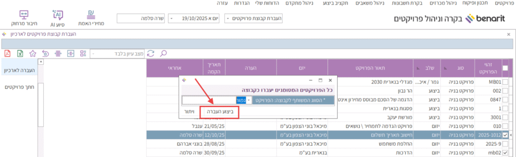 2. נפתח המסך “העברת קבוצת פרויקטים לארכיון”.