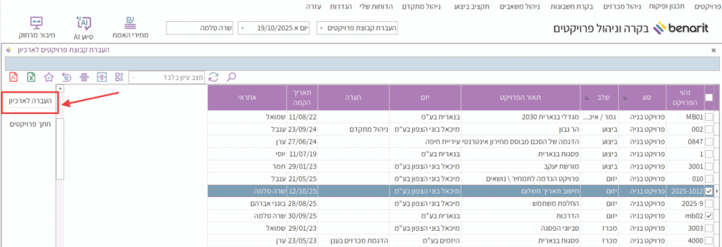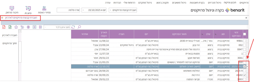 - משורת התפריטים העליונה במסך הראשי של בנארית לבחור בתפריט “פרויקטים” > להצביע על “ניהול ארכיון פרויקטים” > ולבחור בפקודה: “העברת קבוצת פרויקטים לארכיון”: