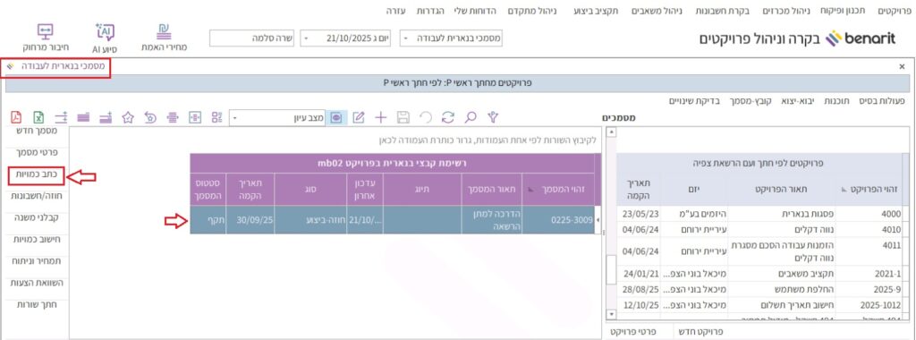 1. במסך “מסמכי בנארית לעבודה” מסמנים את המסמך שבו המפקח צריך לבדוק ולאשר כמויות, ובסרגל השמאלי לוחצים על “כתב כמויות”: