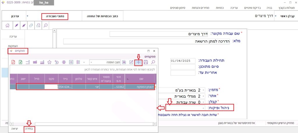 3. במסך נתוני העבודה, בשדה “ניהול ופיקוח” בוחרים במפקח מתוך רשימת המפקחים הנפתחת. אם הוא לא מופיע ברשימה, ניתן להוסיף אותו באמצעות לחיצה על כפתור ההוספה למעלה בסרגל הכלים: