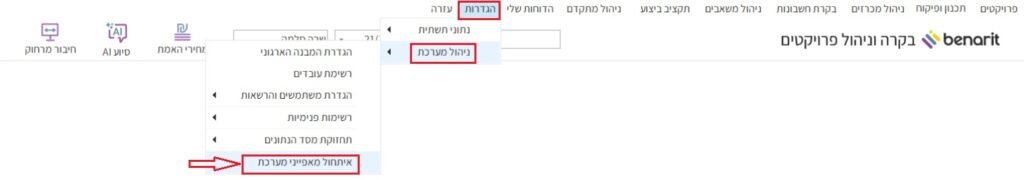 4. יש לוודא שמנגנון “הרשאות לפעולה” מופעל: במסך הראשי של בנארית נכנסים לתפריט “הגדרות”> “ניהול מערכת” > ובוחרים “איתחול מאפייני מערכת”: