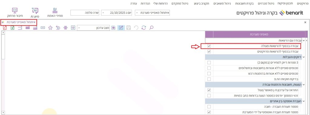 5.מוודאים שמסומנת האפשרות “עבודה בכפוף להרשאות פעולה”. אם לא – לוחצים על תיבת הסימון ומפעילים את התוכנה מחדש (בענן- להתנתק ולהתחבר):