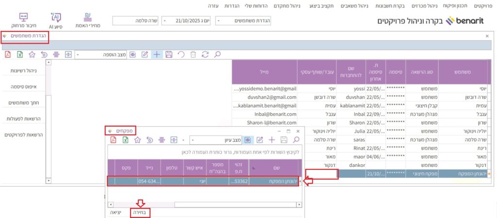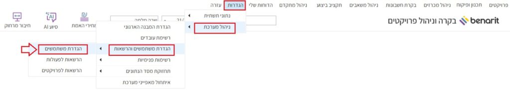 6. כעת נגדיר משתמש שמשויך למפקח: במסך הראשי של בנארית נכנסים לתפריט “הגדרות”> “ניהול מערכת” > “הגדרת משתמשים והרשאות”> ובוחרים”הגדרת משתמשים”: