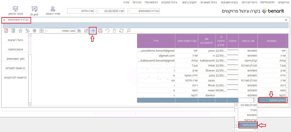 7. במסך “הגדרת משתמשים” לוחצים על כפתור ההוספה בסרגל האייקונים. מקלידים את שם המשתמש ובשדה “סוג הרשאה” בוחרים “מפקח חיצוני”: