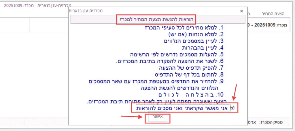מתבצעת התחברות למכרזית-ענן ובכניסה למכרז מתקבלת חלונית “הוראות להגשת הצעת המחיר למכרז”.