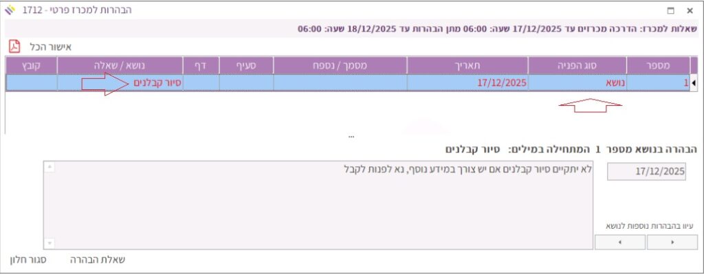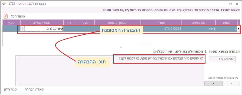 בחלונית העליונה מופיעה רשימת ההבהרות, ובחלונית התחתונה מופיע תוכן ההבהרה של ההבהרה המסומנת: