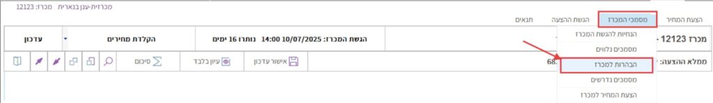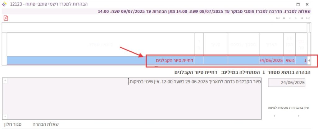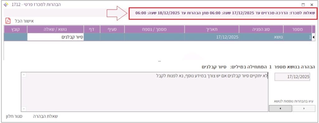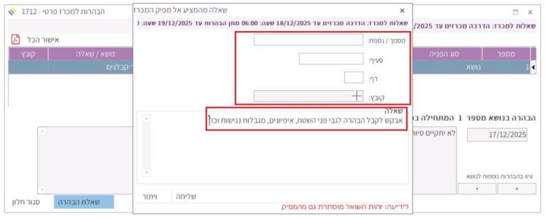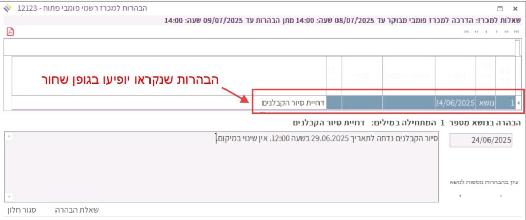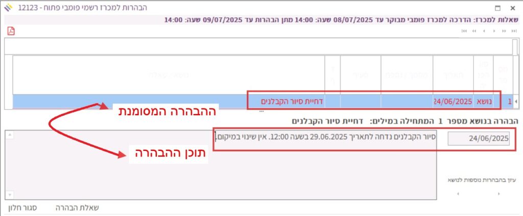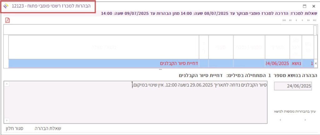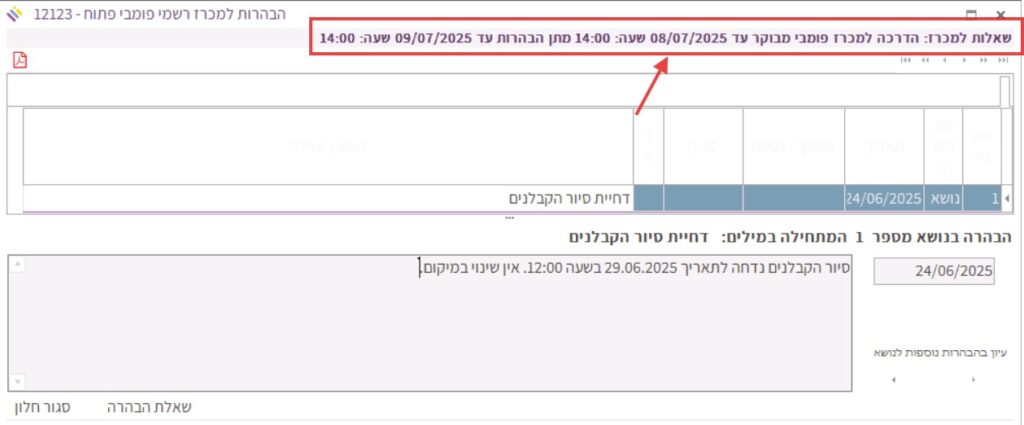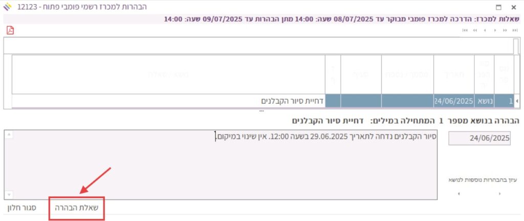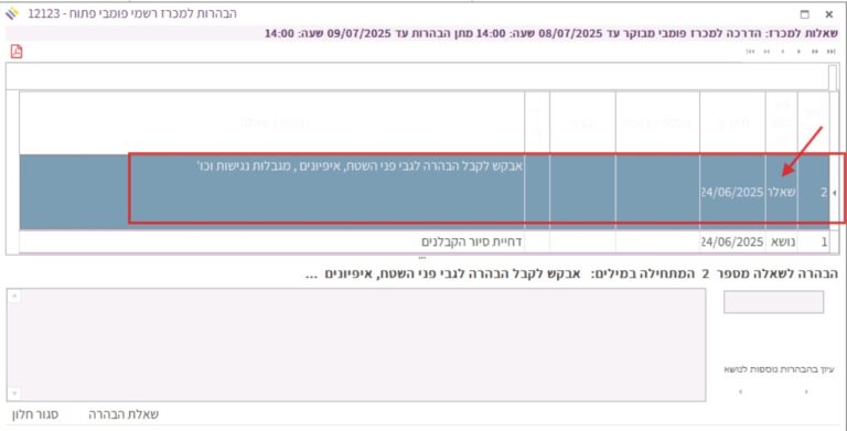 המועד האחרון לשליחת שאלות הבהרה למפיק המכרז מופיע בפס העליון של החלונית “הבהרות למכרז”: