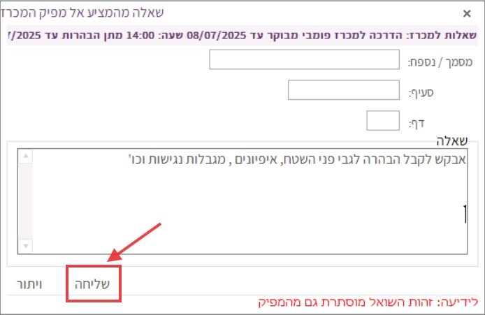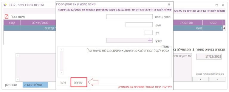 כדי להשלים את שליחת השאלה אל מפיק המכרז יש ללחוץ על הכפתור “שליחה”: