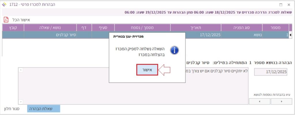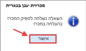 מופיעה הודעה על כך שהשאלה נשלחה אל מפיק המכרז בהצלחה. ללחוץ על “אישור”: