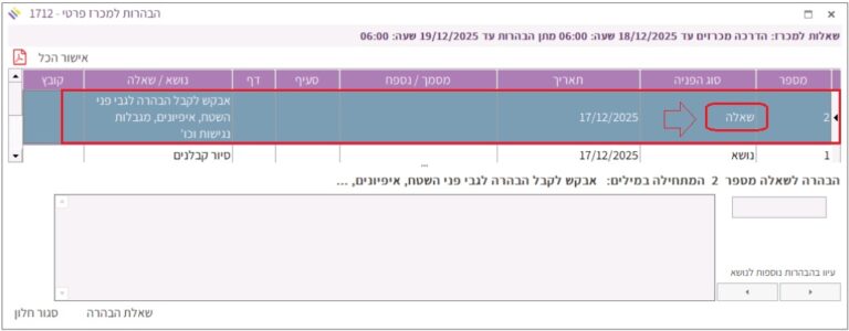 שאלת הקבלן מתווספת לחלונית “הבהרות למכרז” (בשדה “סוג הפניה” יופיע “שאלה”):