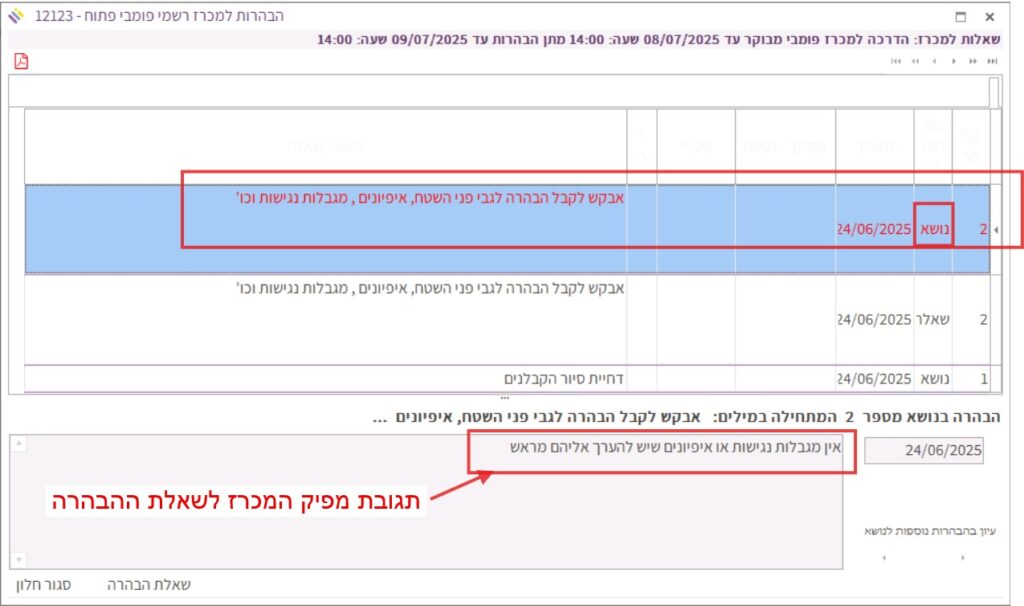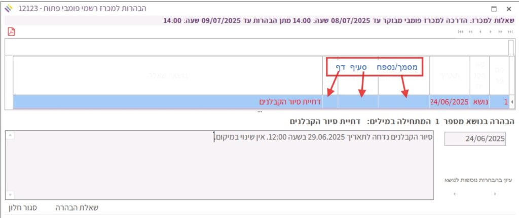 בשורה של ההבהרה מופיע: מס’ סידורי, נושא ותאריך ההבהרה. אם קיימת הפניה למסמך/נספח ספציפי, יופיע גם מידע זה. (שדות אלה הם אופציונליים ולא בהכרח ימולאו על ידי מפיק המכרז):