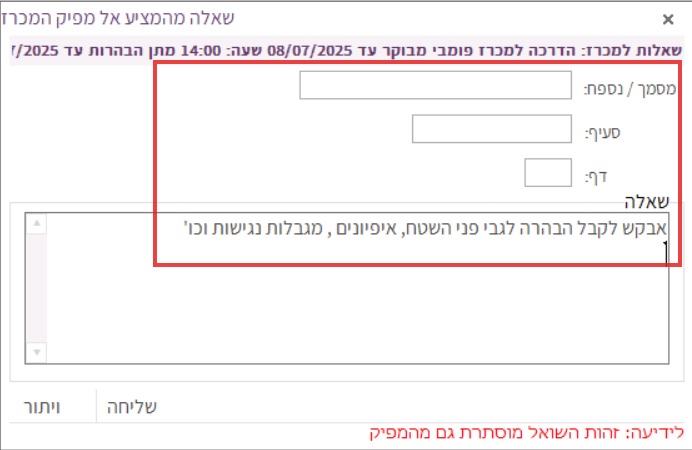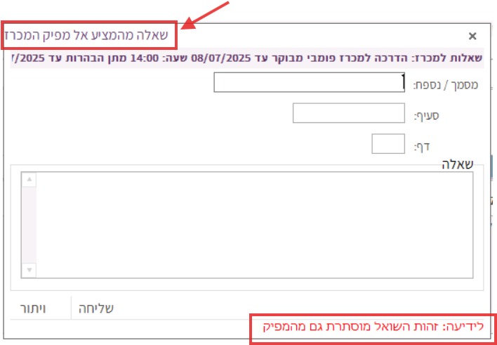 2. נפתחת חלונית “שאלה מהמציע אל מפיק המכרז”