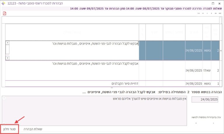 כדי לצאת מחלונית “הבהרות למכרז” יש ללחוץ על הכפתור “סגור חלון”: